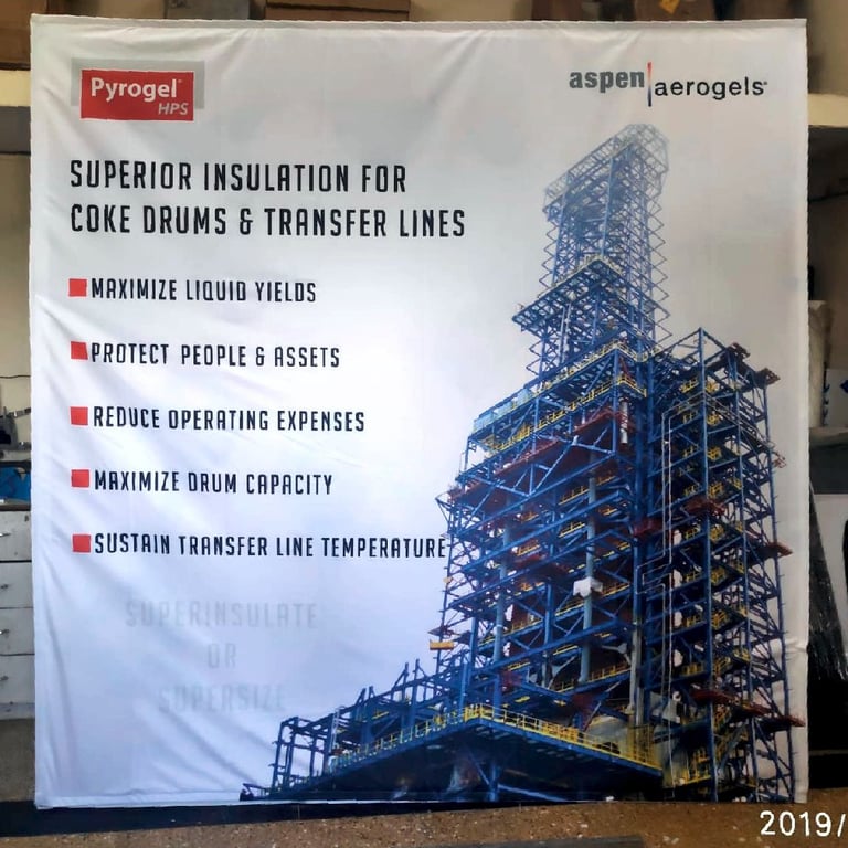 Fabric pop up is used to erect partitions or backdrops for various occasions or just to display large hoarding size banners on site.