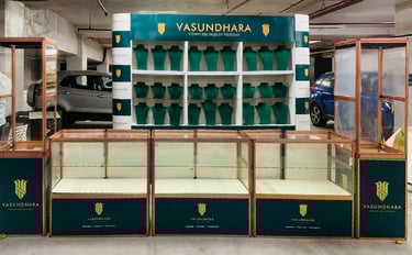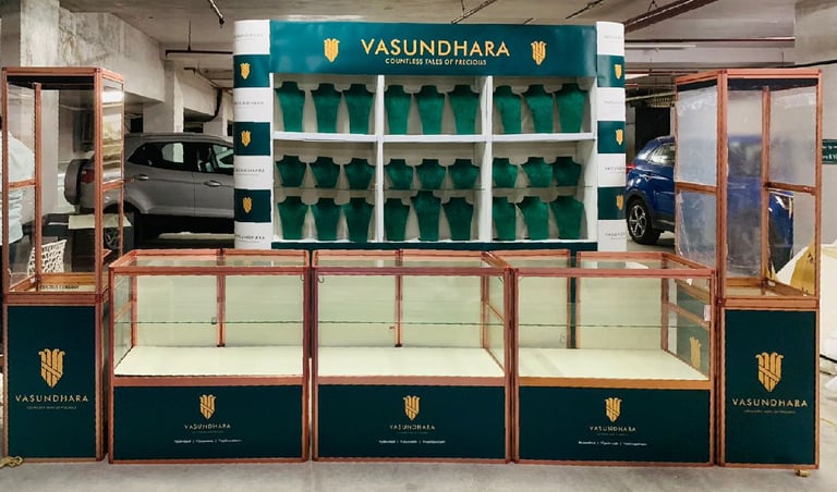 Back drop like show case as well as display and sales counters are all portable and each set of three tables and one show case would just take not more than one hour and time taken would reduce as you get practice.