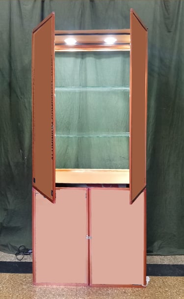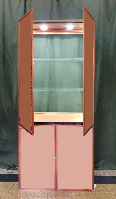 The 3D folding Tower folds both in height and depth, reducing to a manageable size of just 36" by 48" and fits into a protective cloth carry bag. Watch the 3 D tower installation video linked here to see the setup process. It features two LED spotlights from above and three side LEDs on the top shelf, plus two additional side LED lights on the lower levels, making it one of the brightest displays available globally. The back can be left open for aesthetic appeal, or you can request back doors or a front acrylic slider for your convenience.
